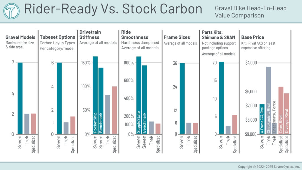 This chart illustrates six ways in which Rider-Ready bikes are overwhelmingly better than stock carbon bikes. You can get all of this at a competitive price and have it built in the USA by Seven.